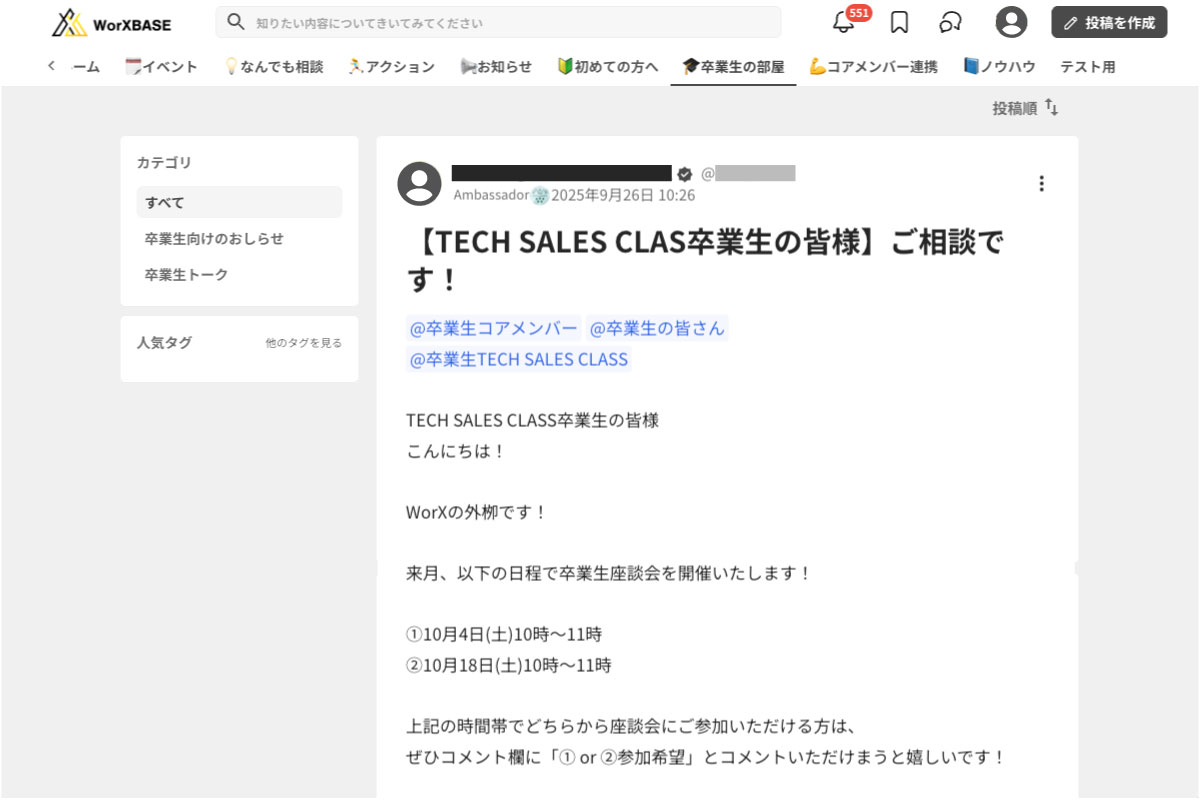WorXが主催する、卒業生を対象としたイベントの案内も随時行っています。"