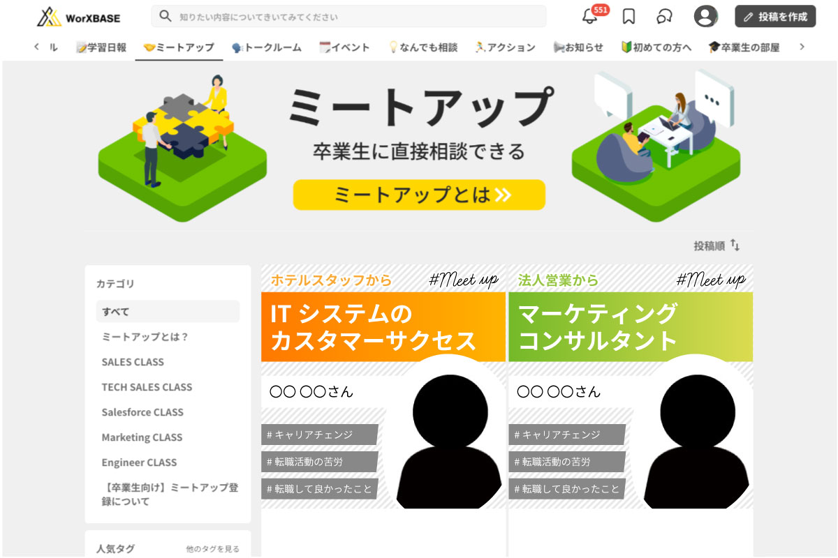 オープンなSNSには書きづらい転職の悩みやちょっとした不安も、ここなら同じ境遇の仲間と共有できます。"